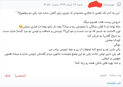یه بنده خدای ترسویی که حتی جرات فاش کردن هویت واقعیشو نداره با اسمای حسین، رحیم، مسعود و شاید یکی دو تا اسم دیگه، کامنتای خصوصی ِ بدون آدرس میفرسته، خیلیم سعی داره خودشو فهیم و دانا و کتابخوون معرفی کنه!! خیلیم پافشاری میکنه تا ثابت کنه من سواد و اطلاعات چندانی ندارم، و اهل مطالعه و کتاب نیستم!!