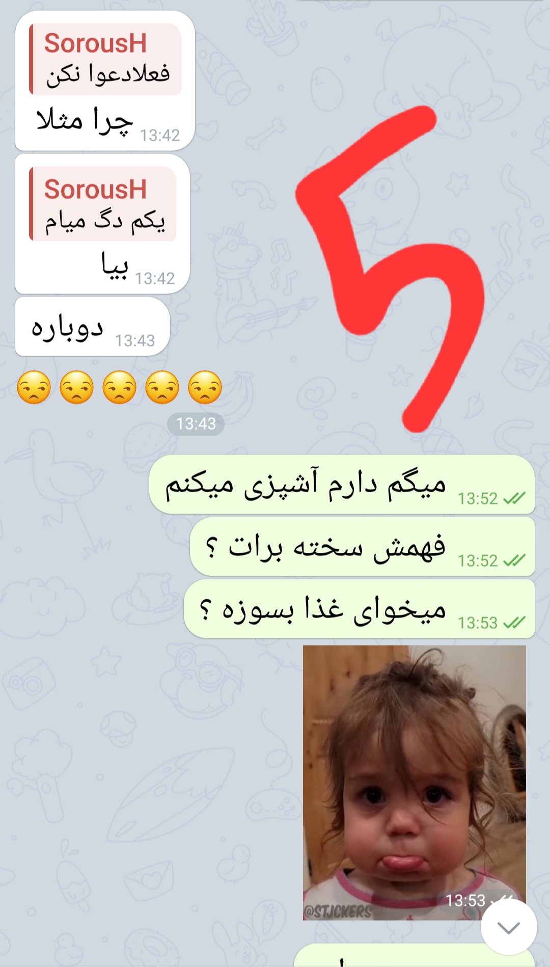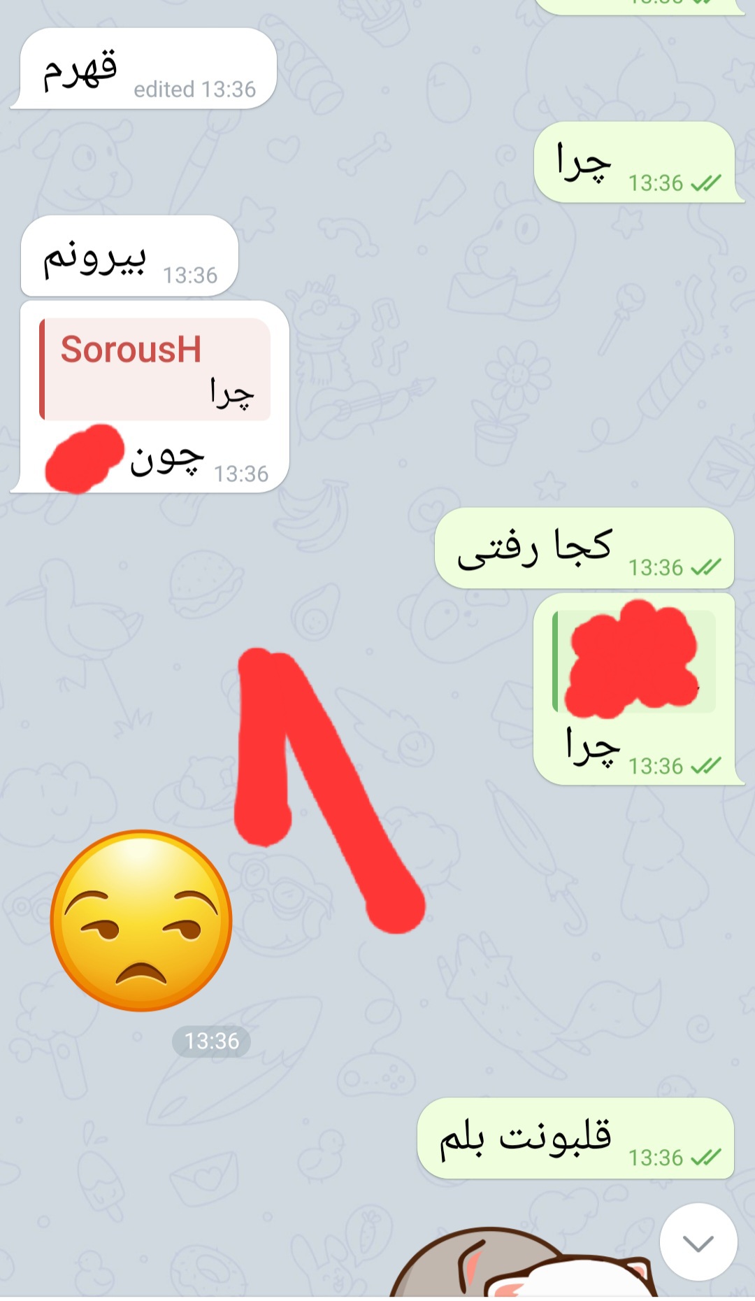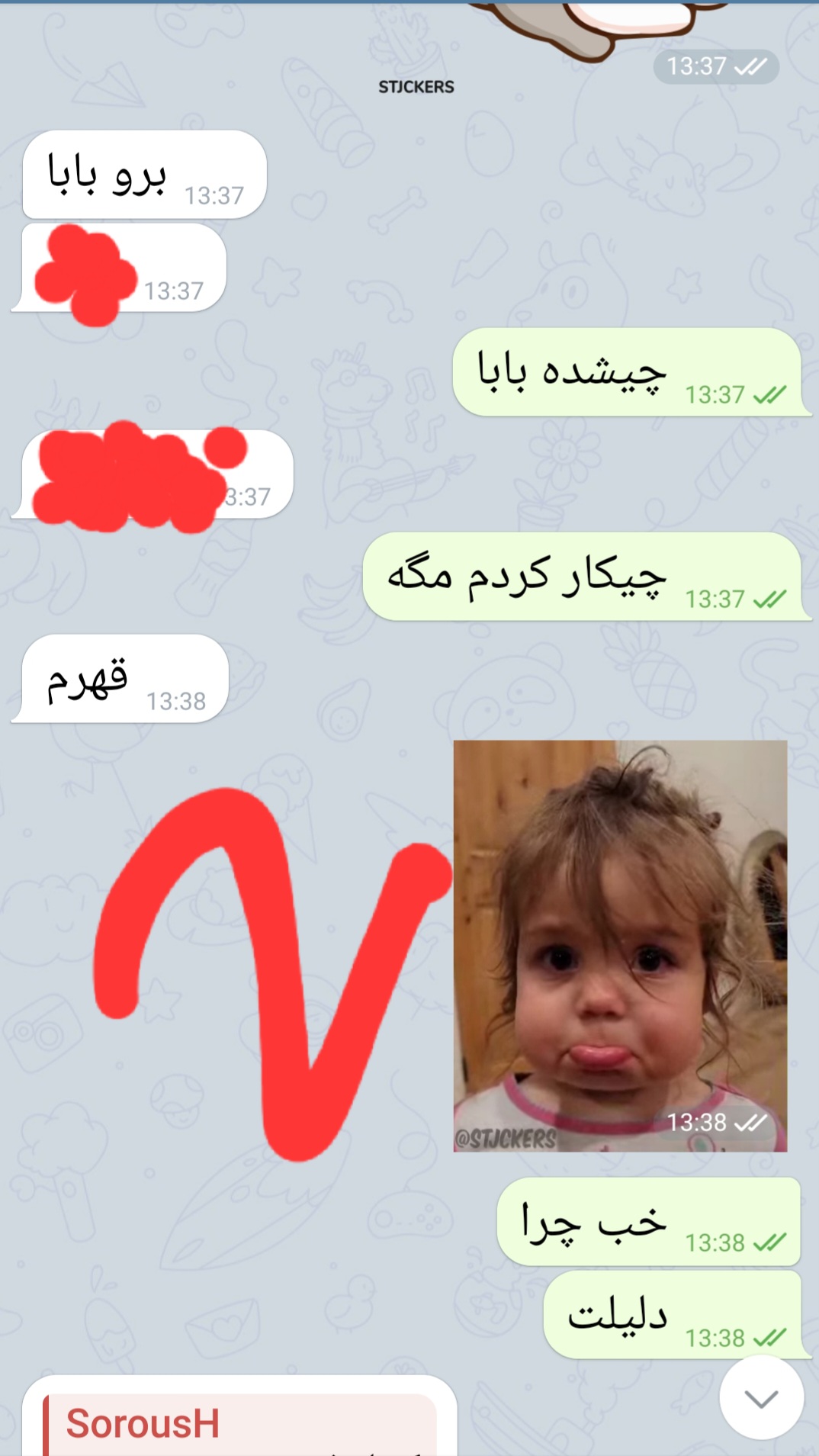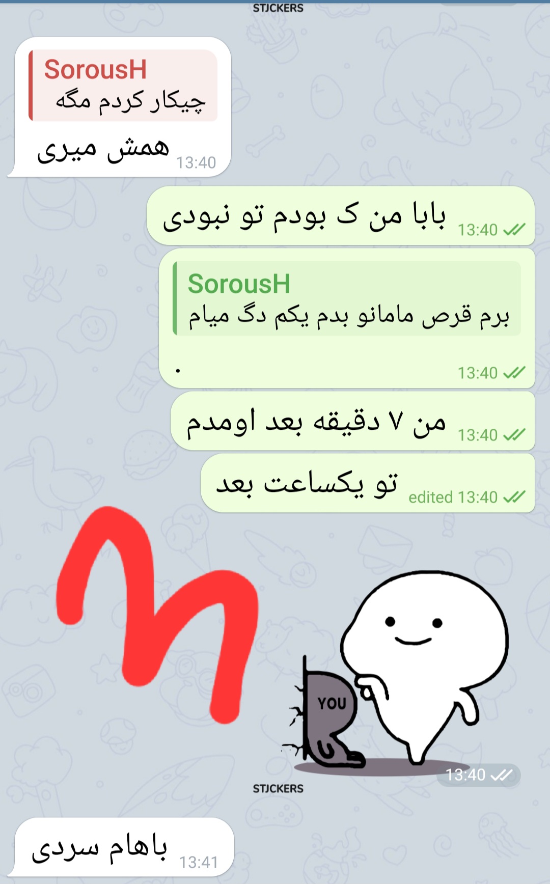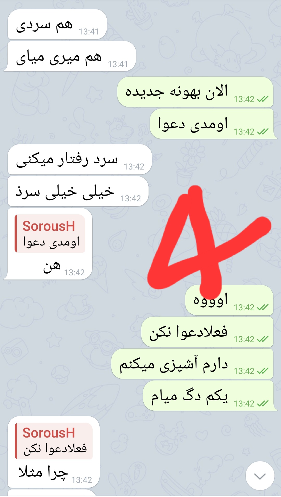 عصرش باز پیام دادم و دوباره چند ساعت دعوا کرده! شبش پیام دادم و دوباره ۳ ۴ ساعت دعوا کرده و فحش داده!